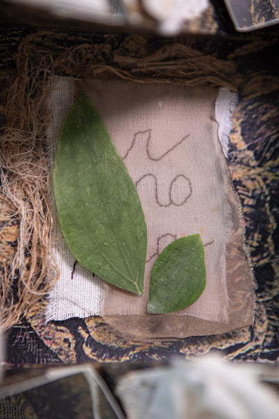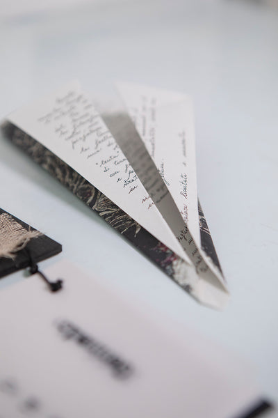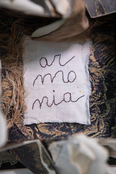 L'origami si apre e all'interno compaiono una striscia di tessuto antico ricamato a mano con la parola armonia e una striscia di chiffon in seta, su cui sono incollate due foglie di peonia essiccate.