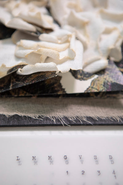 Il calendario è composto da una tavoletta in legno da cm 20x20, su cui sono incollati due fasce in tessuto garza di cotone grezza e un origami stampato di dimensioni cm 14x14.